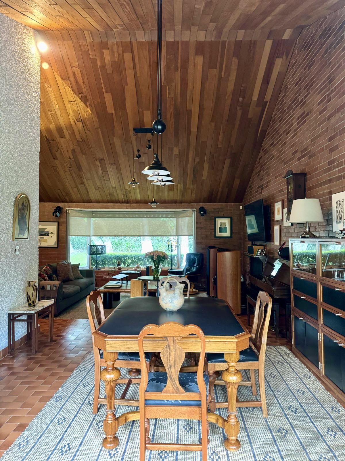 Tiene 4 recamaras y 3 baños completos, amplia sala y comedor, chimenea, cocina equipada, sala tv, estudio, cuarto de servicio, lavandería y 4 estacionamientos.