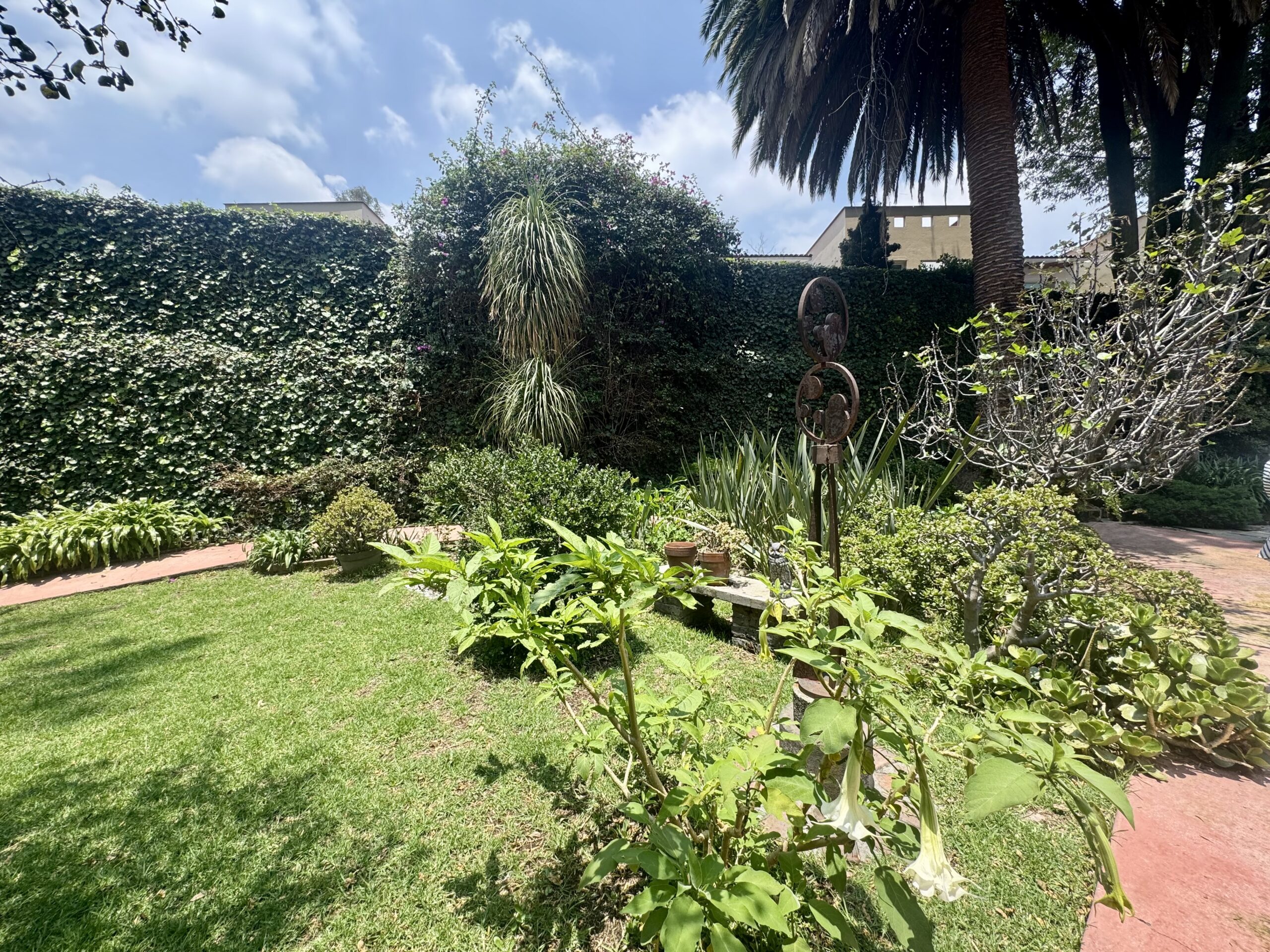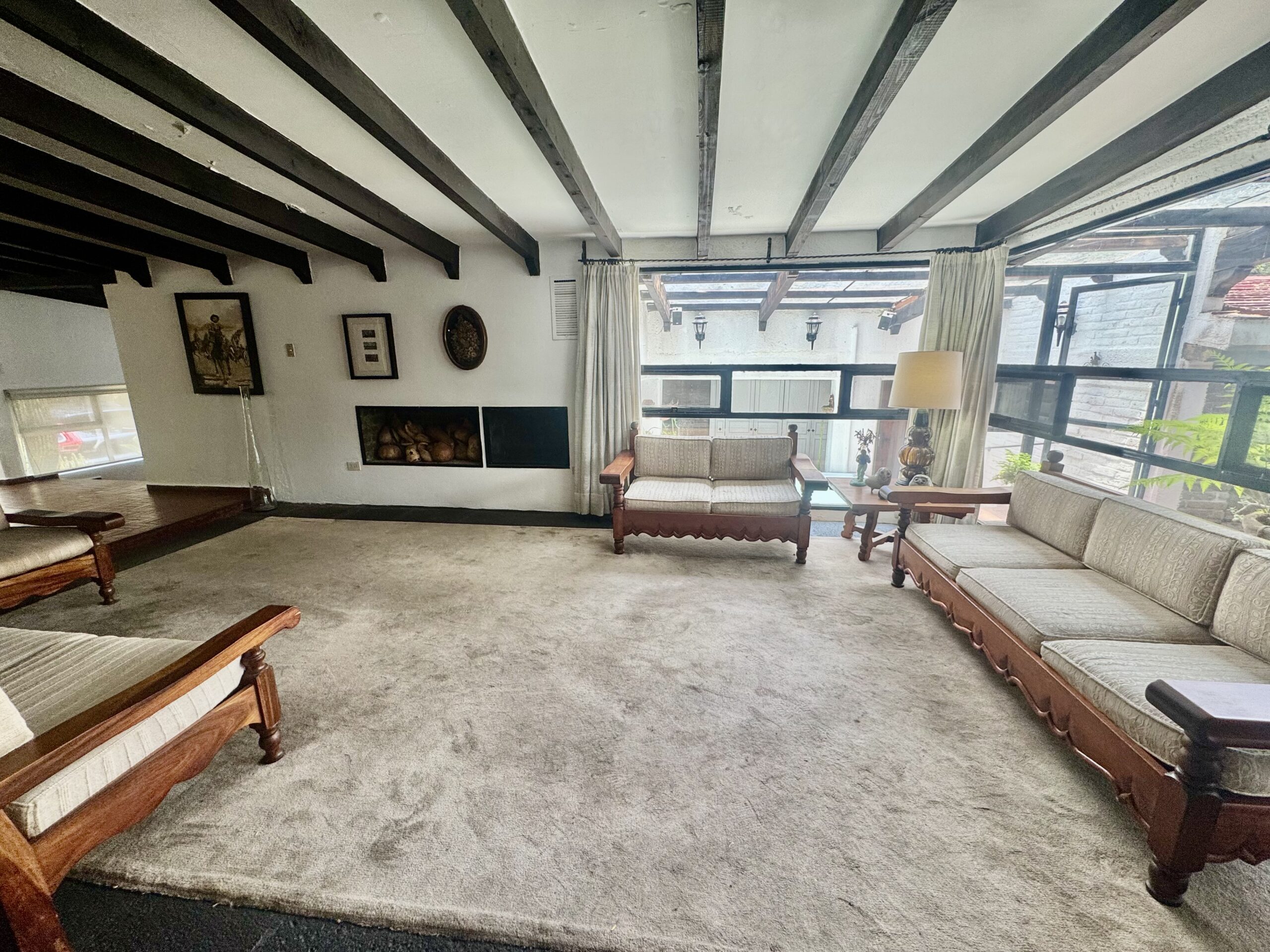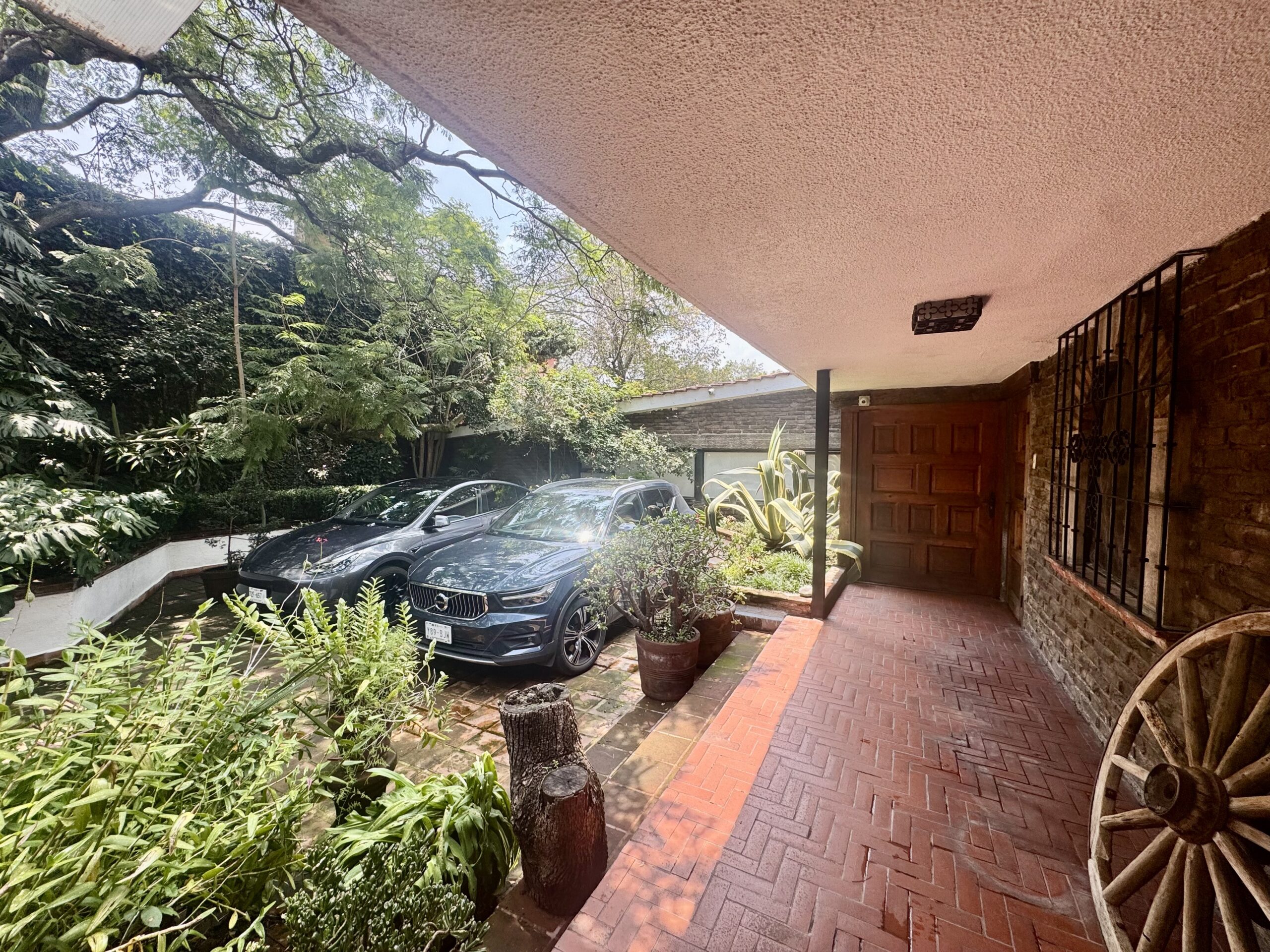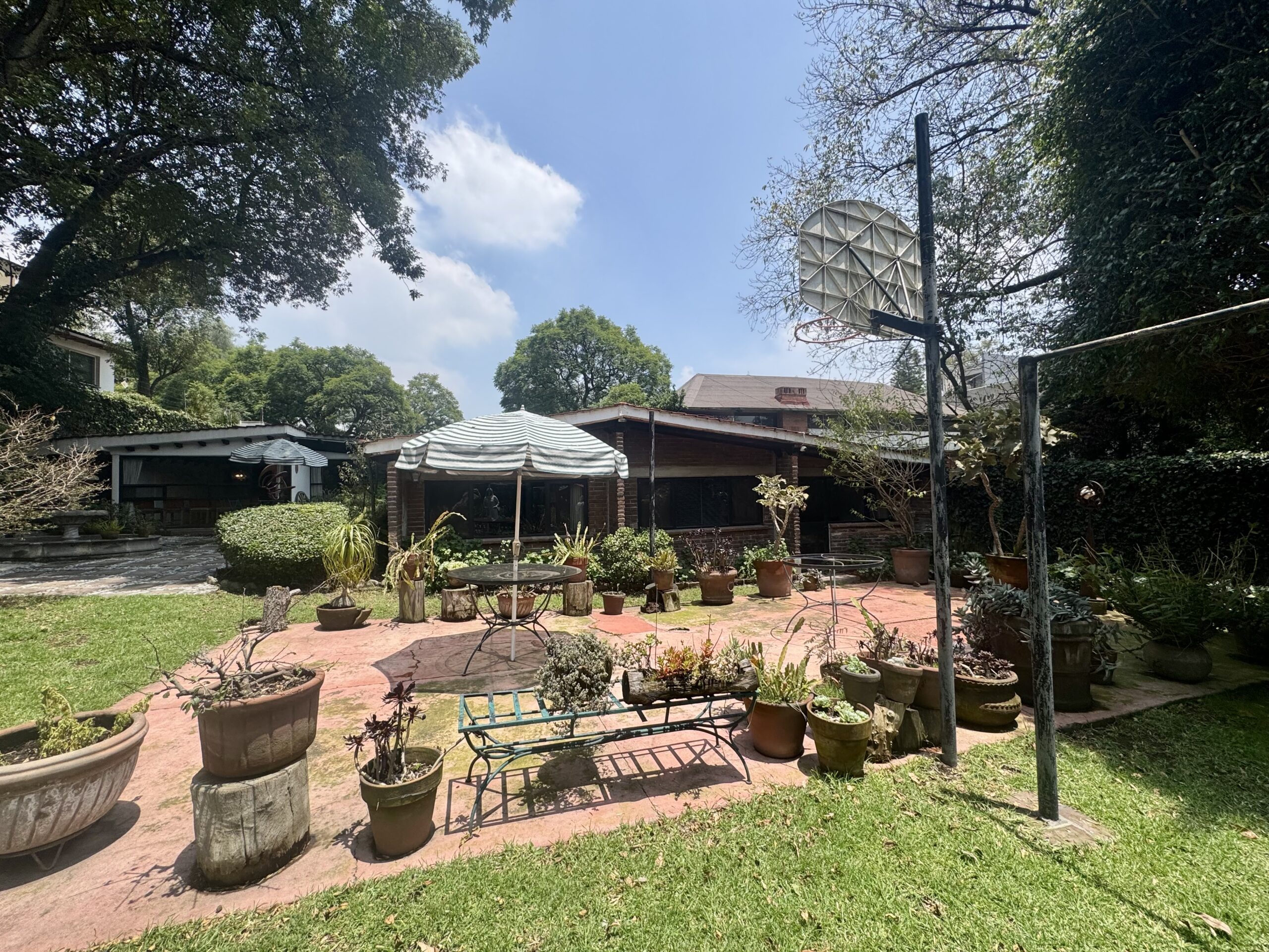 Tiene una amplia e iluminada sala comedor con salida al espectacular jardín que tiene plantas y palmeras, terraza con asador y una linda fuente. Cocina cerrada y ante comedor. Cuenta con cuarto de servicio y baño de servicio y medio baño de chóferes con Caseta de Vigilancia. Ideal para actualizar y dejarla a tu gusto. Uso de suelo habitacional para dos casas.